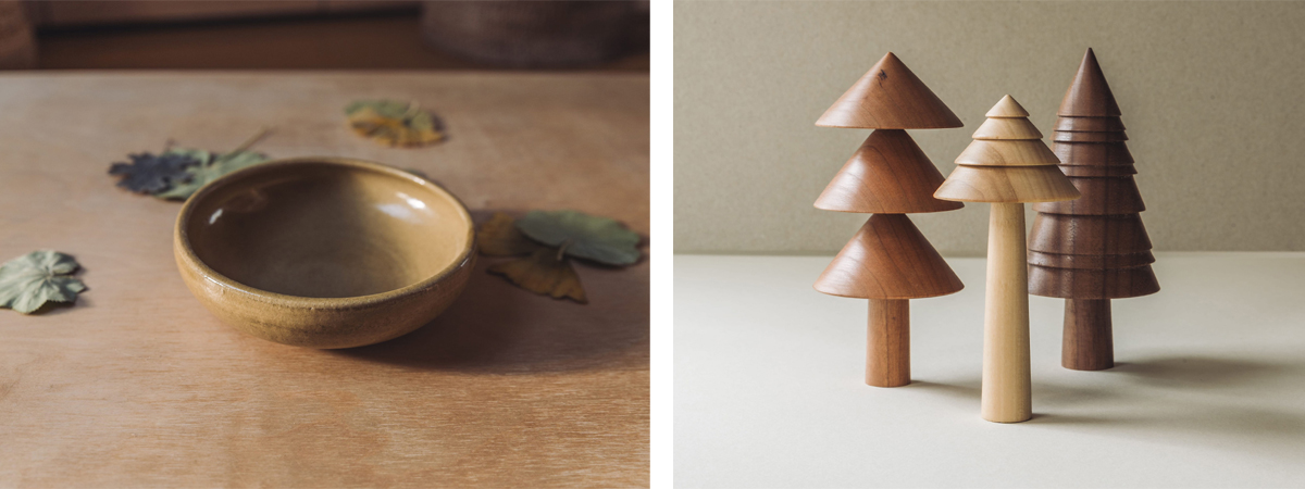 Celadon bowl, Gillian Highland/Hand-turned wooden trees, Forge Creative
