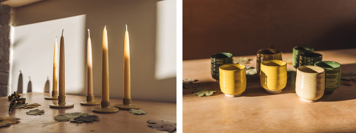 Candle-holders and teabowls in Flax, Gorse & Verdant colourways, Lucy Rutter