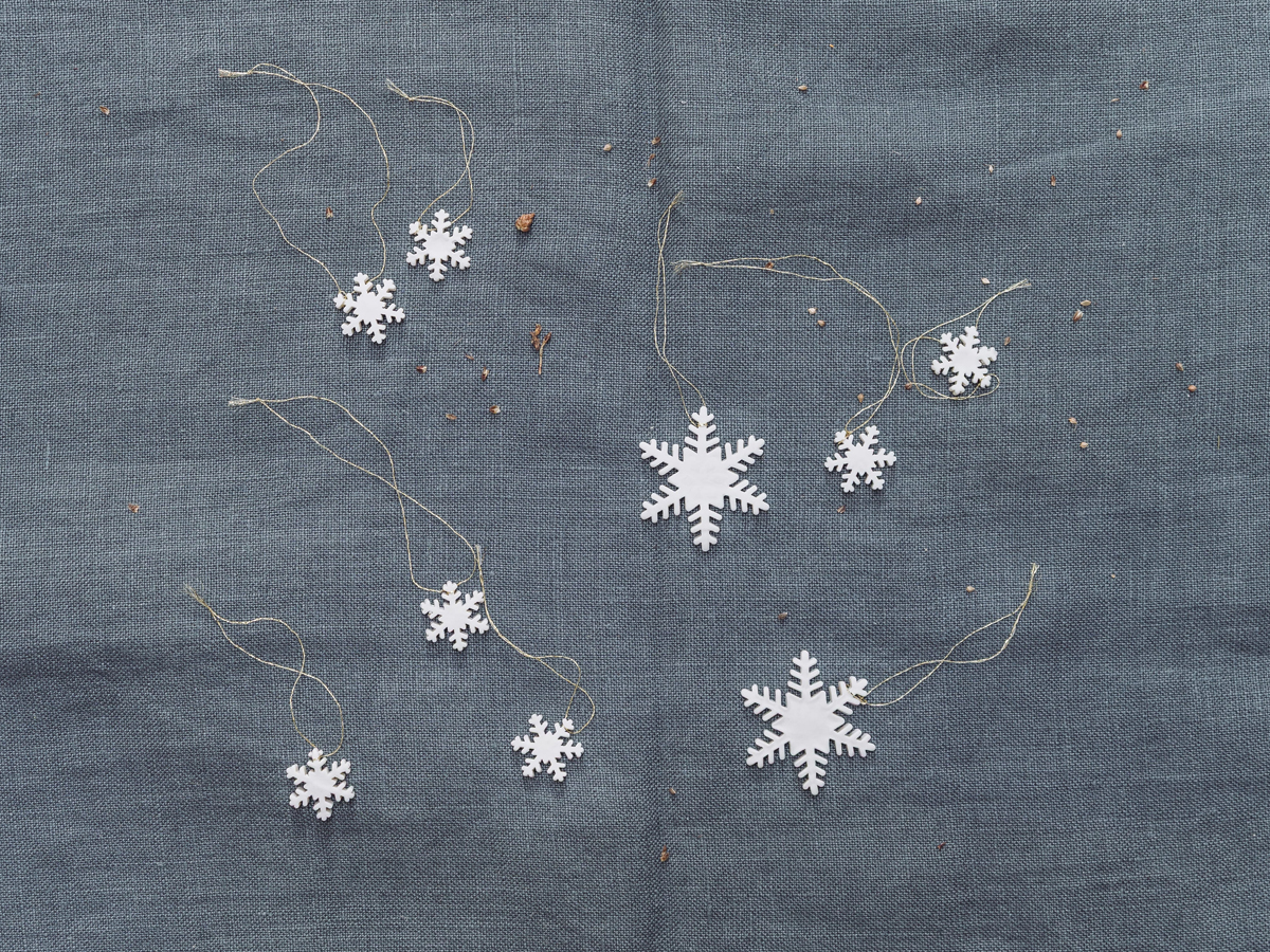 Handmade porcelain snowflakes, hung on metallic thread by Vicky Hageman.