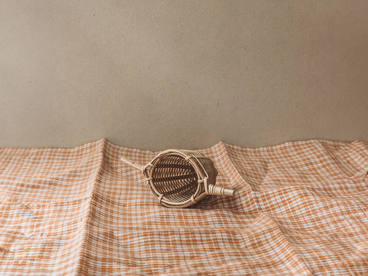 Hand-woven bamboo tea strainer. Tea basket measures 60mm deep and 55mm wide, extent of handles 130mm wide.