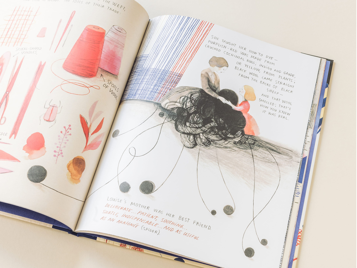 Louise Bourgeois (1911–2010) is a world-renowned modern artist noted for her sculptures made of wood, steel, stone, and cast rubber. Her most famous spider sculpture, Maman, stands more than 30 feet high. Just as spiders spin and repair their webs, Louise’s own mother was a weaver of tapestries. Louise spent her childhood in France as an apprentice to her mother before she became a tapestry artist herself. She worked with fabric throughout her career, and this biographical picture book shows how Bourgeois’s childhood experiences weaving with her loving, nurturing mother provided the inspiration for her most famous works.