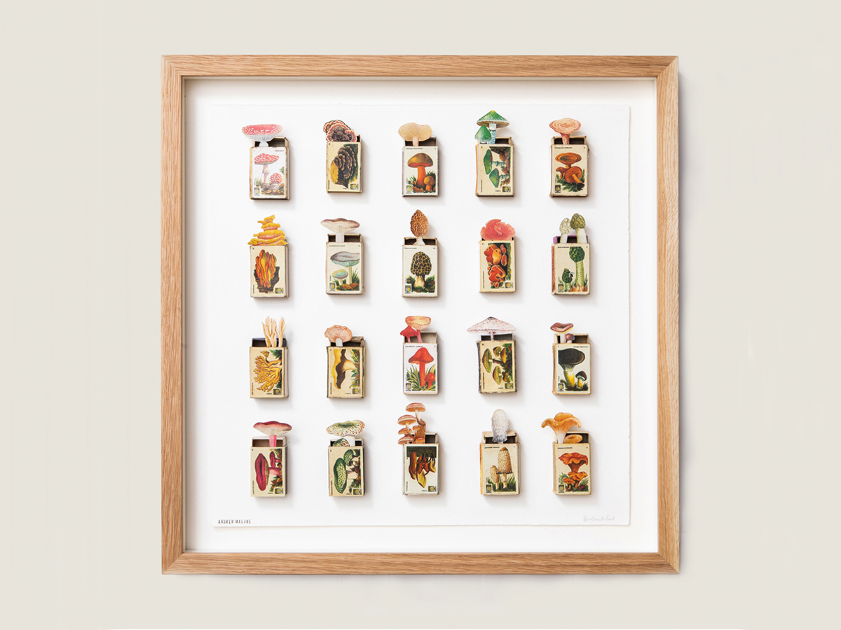 Handcut paper fungi artwork, created with vintage matchboxes and cutouts from period nature books, signed by the artist;  size 530mm x 530 mm.