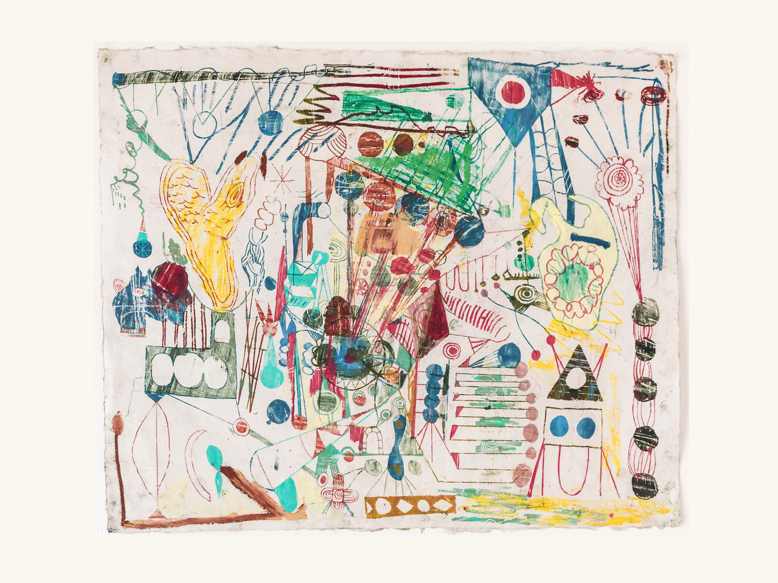 Monoprint (with the drawing on the reverse of the paper) using oil-based pastels on Kitakata 110gsm handmade Japanese paper with a deckle edge. Size 520 x 440mm.