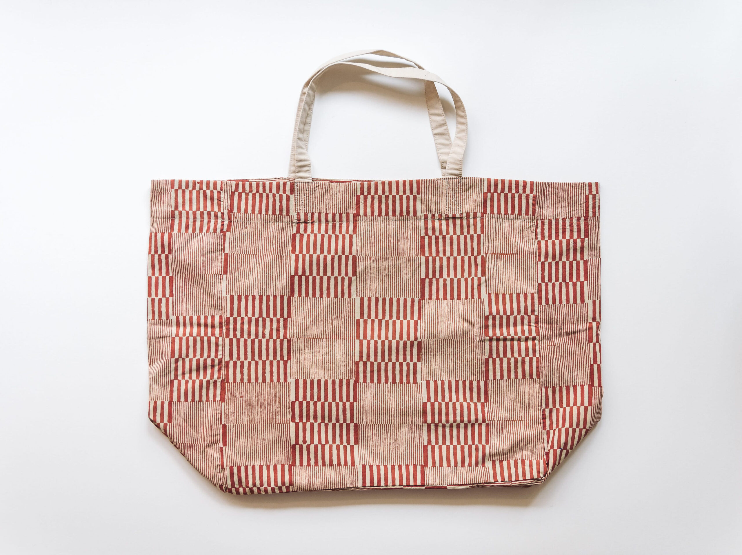 Large tote bag designed and made by Louisa Loakes. This bag was hand block printed in India using natural dyes from the root of the Madder plant.