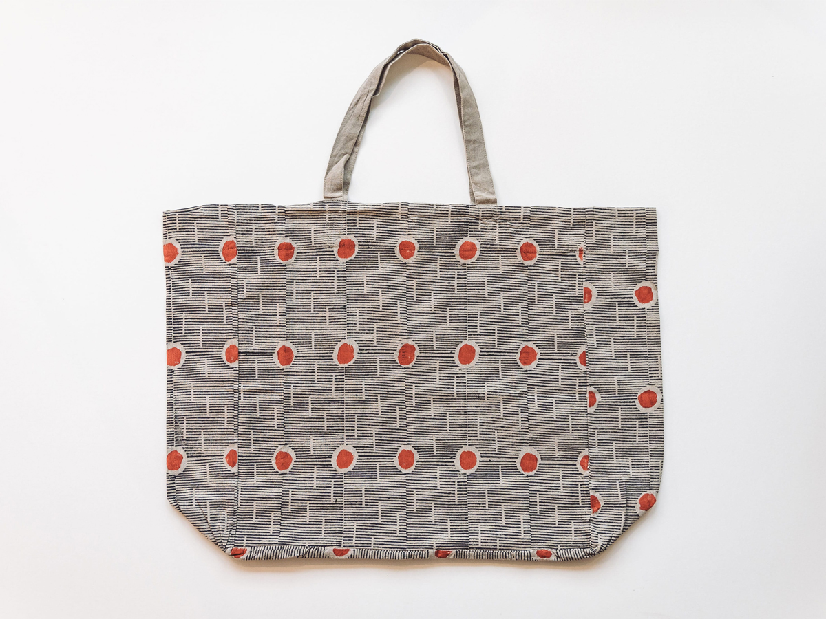 Large tote bag designed and made by Louisa Loakes. This bag was hand block printed in India using natural dyes, Madder and iron, onto 100% Organic Cotton.