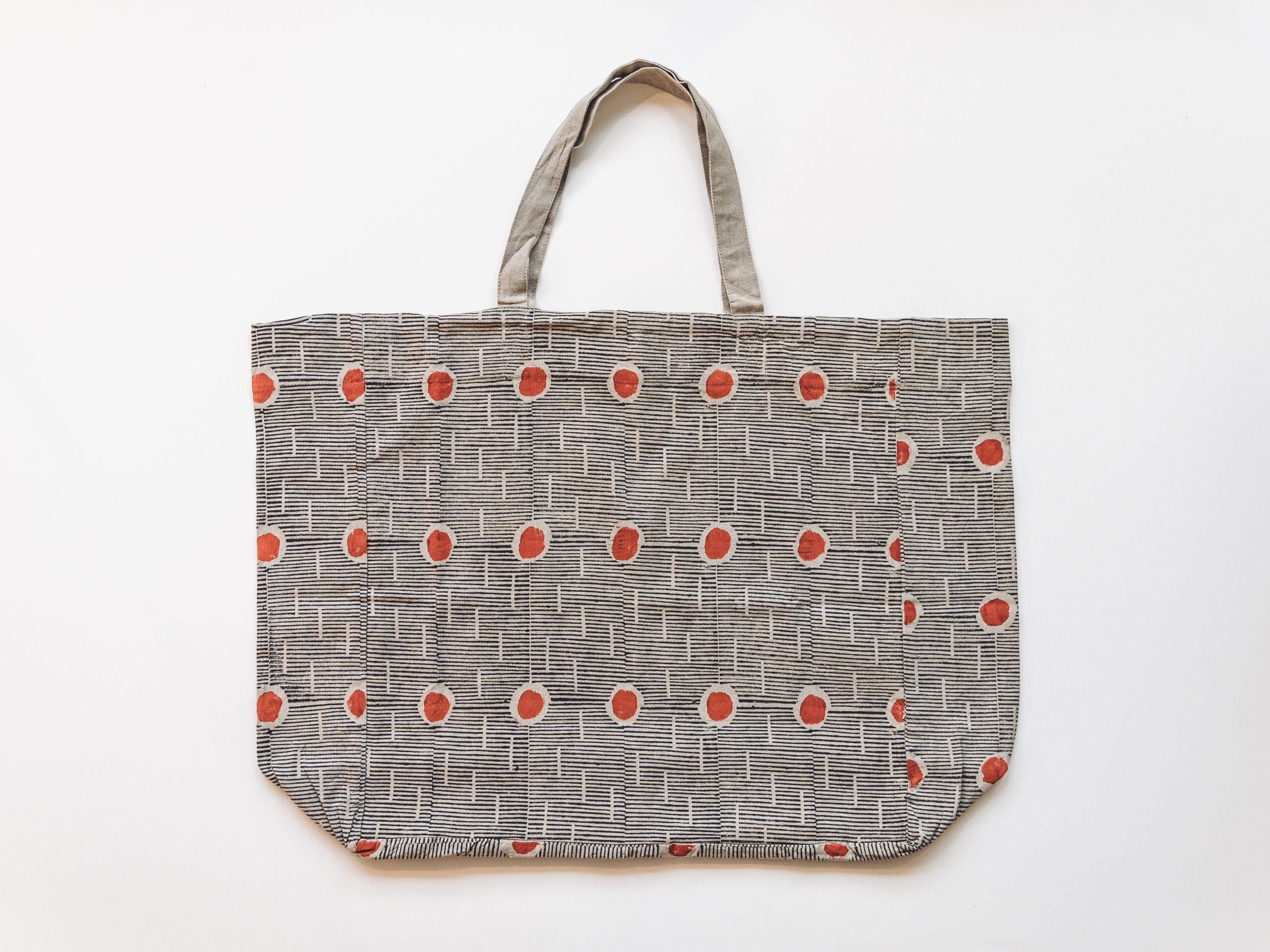 Large tote bag designed and made by Louisa Loakes. This bag was hand block printed in India, with the orange detailing hand painted by Louisa in her London Studio.